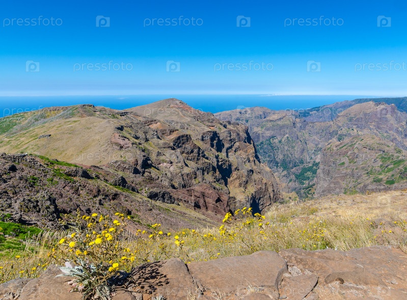 Горный пейзаж острова Мадейра, желтые цветы на переднем плане. Остров Мадейра, Португалия