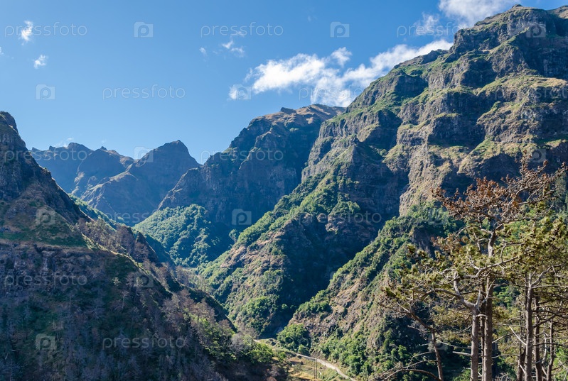 Ущелье в горах острова Мадейра. На переднем плане сосна. Остров Мадейра, Португалия