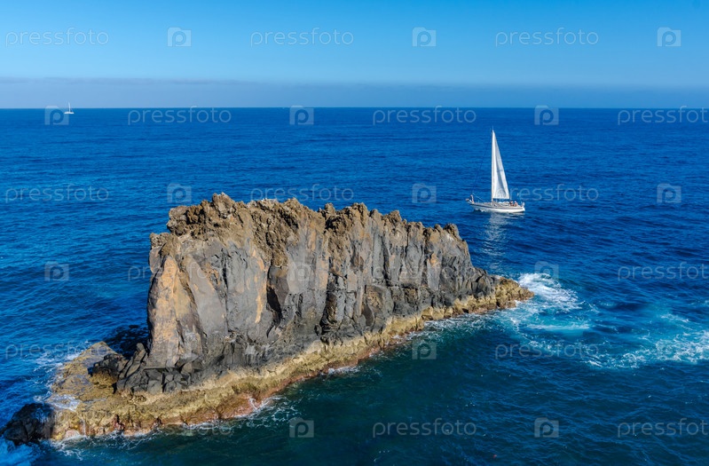 Небольшой остров в океане и парусная яхта. Остров Мадейра, Португалия