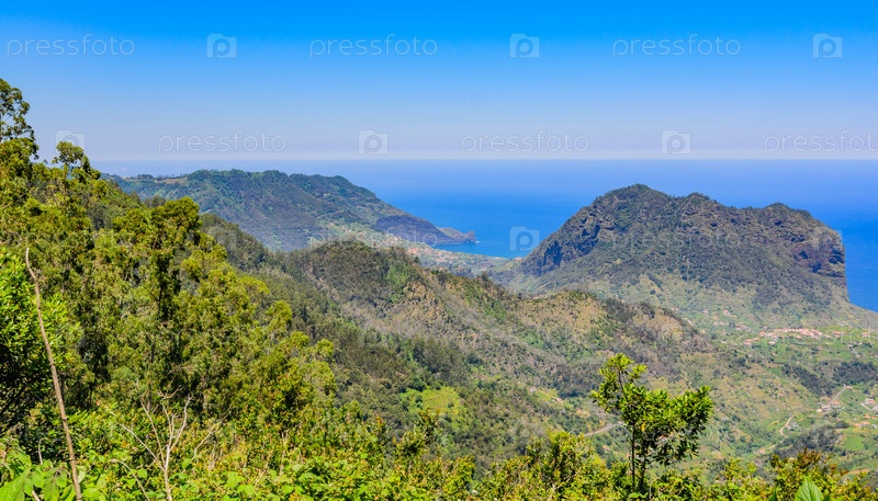 Красивый пейзаж Порту-да-Крус с Левадой Рибейро Фрио - Портелой на деревьях на переднем плане. Остров Мадейра, Португалия