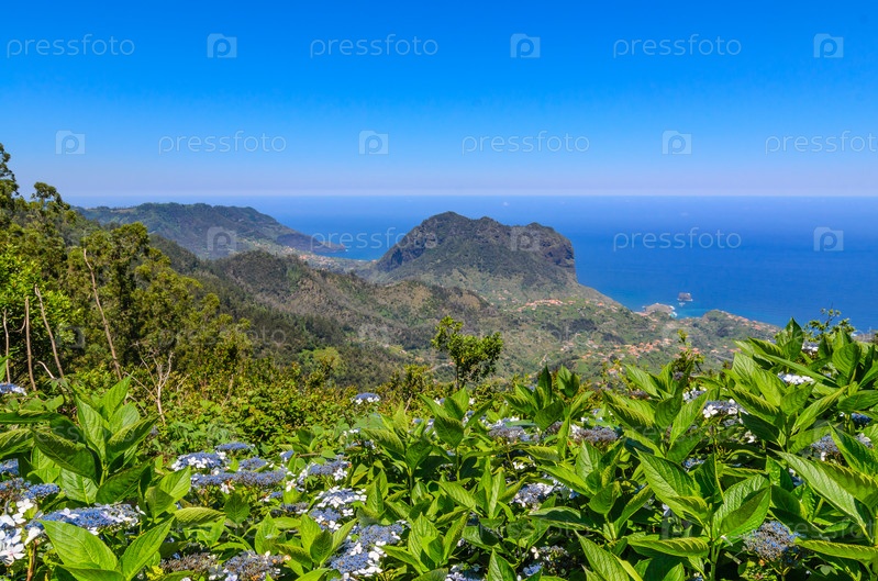 Красивый пейзаж Порту-да-Крус с Левадой Рибейро Фрио - Портела на переднем плане с цветами. Остров Мадейра, Португалия