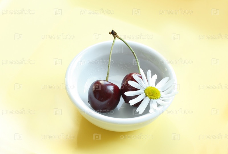 Пиала с черешней на белом фоне