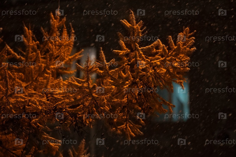 Россия. Юг Западной Сибири, Новокузнецк. Осенние желтые лиственницы освещенные уличными фонарями снежным вечером