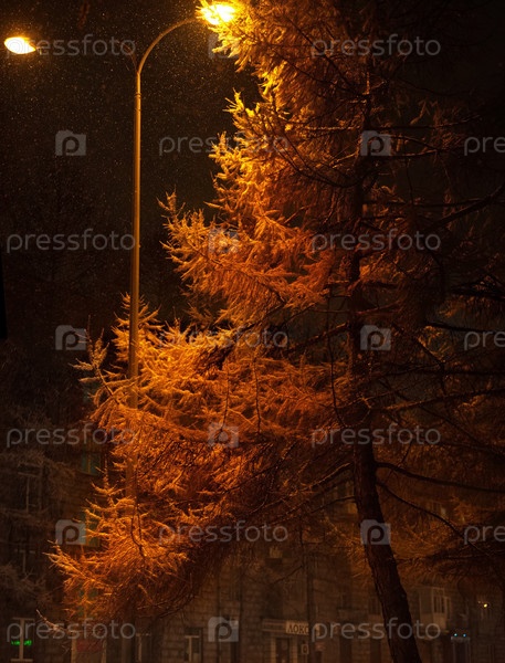 Россия. Юг Западной Сибири, Новокузнецк. Осенние желтые лиственницы освещенные уличными фонарями снежным вечером