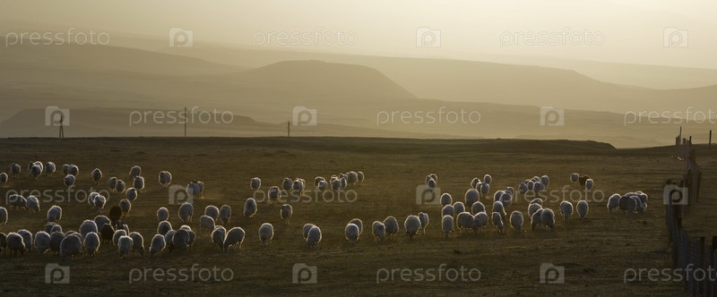 Россия. Северо-Восточный Кавказ. Дагестан. Стадо овец мирно пасется на склонах Кавказских гор на фоне последних лучей вечернего солнца