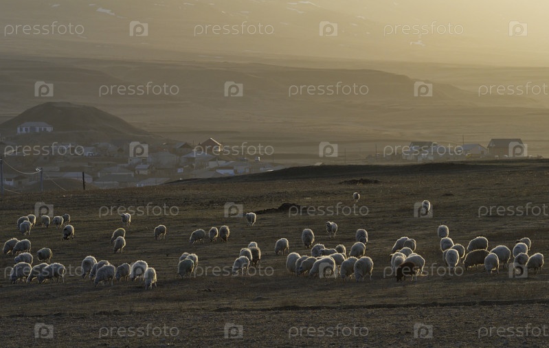 Россия. Северо-Восточный Кавказ. Дагестан. Стадо овец мирно пасется на склонах Кавказских гор на фоне последних лучей вечернего солнца