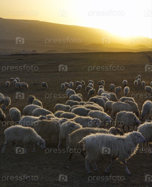 Россия. Северо-Восточный Кавказ. Дагестан. Стадо овец мирно пасется на склонах Кавказских гор на фоне последних лучей вечернего солнца