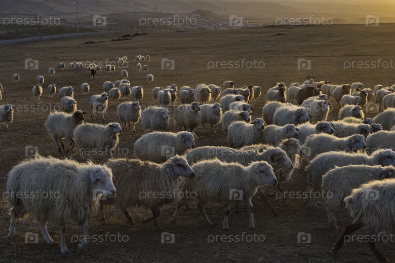 Россия. Северо-Восточный Кавказ. Дагестан. Стадо овец мирно пасется на склонах Кавказских гор на фоне последних лучей вечернего солнца