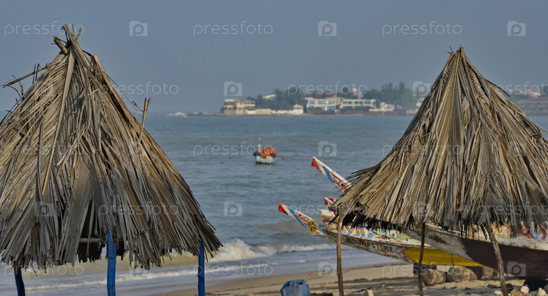 Западная Африка. Сенегал. Конические зонтики из тростника и длинных пальмовых листьев на песчаном пляже курортного города Нгапару на берегу Атлантического океана