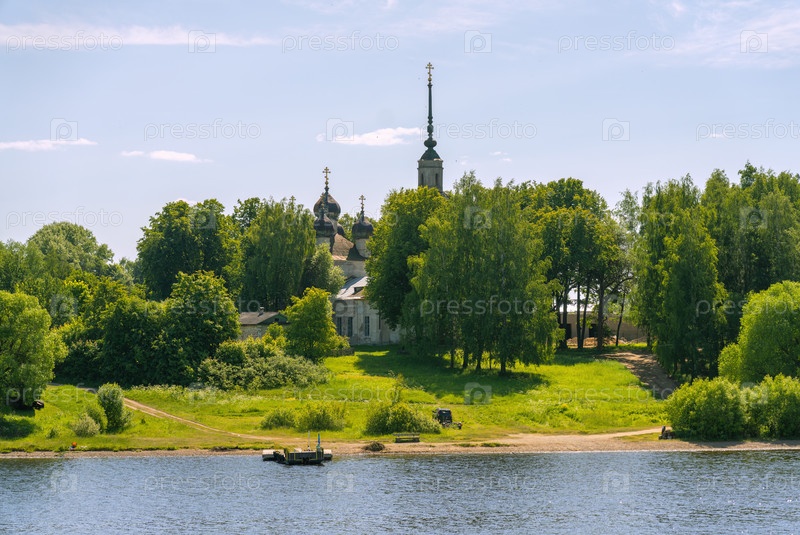 Древняя церковь выглядывает из-за деревьев, растущих на живописном берегу реки Волги