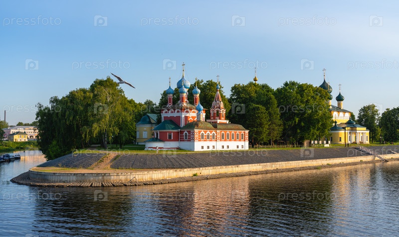 Вид на церковь царевича Димитрия на крови в древнем городе Угличе с реки Волги, панорама