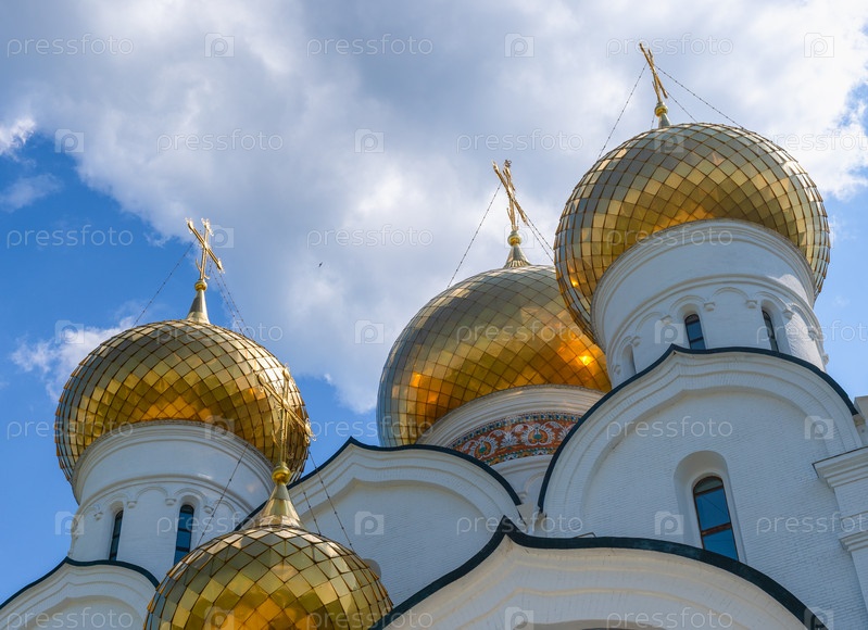 Купола Успенского собора в Ярославле на фоне голубого неба