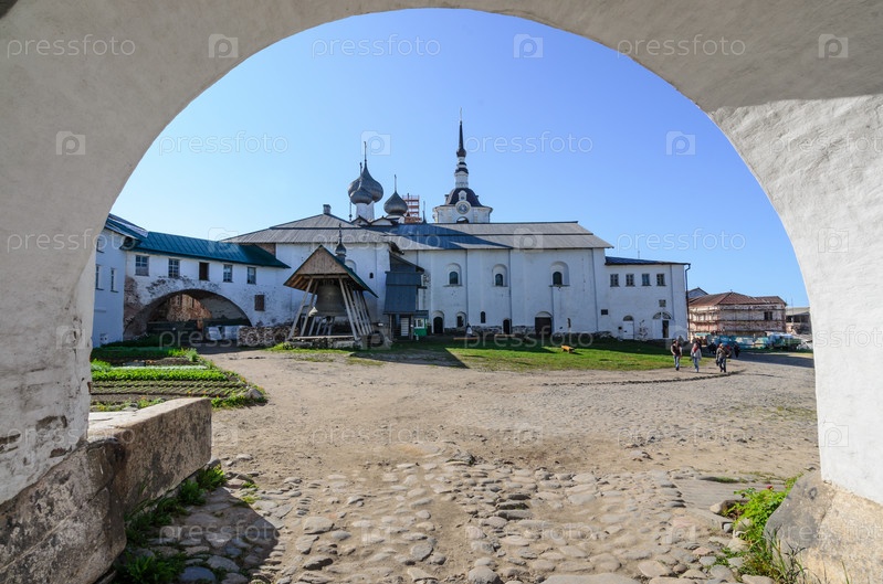Вид от Спасских ворот на колокола и трапезный комплекс Соловецкого монастыря. Соловецкий архипелаг, Белое море, Россия