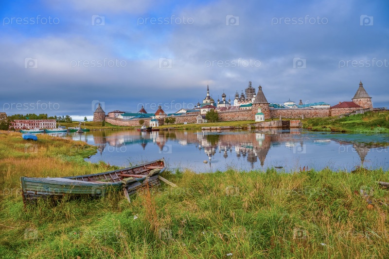 Красивый вид на бухту Процветания и Соловецкий монастырь. На переднем плане старая рыбацкая лодка. Соловецкий архипелаг, Белое море, Россия