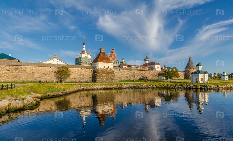 Вид на Соловецкий Кремль вечером с отражением. Соловецкий архипелаг, Белое море, Россия
