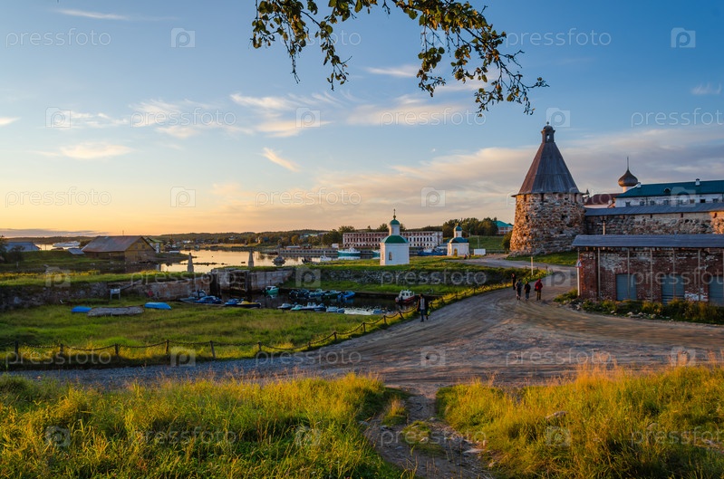 Красивый вечерний пейзаж на Соловках во время заката солнца (золотой час) Белое море, Россия