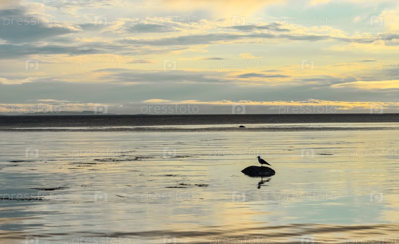 Закат и чайка на Соловках. Большой Соловецкий остров, Россия