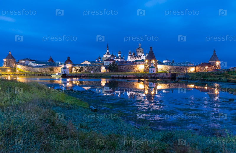 Вечер благосостояния залива, ночная съемка, отражение. Соловецкий архипелаг, Белое море, Россия