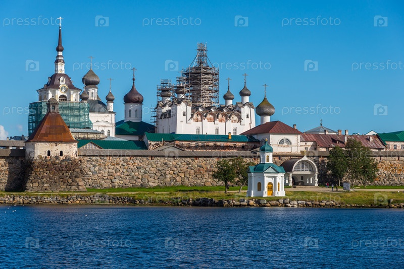 Вид на Свято-Троицкий собор и колокольню Соловецкого монастыря. Соловецкий архипелаг, Белое море, Россия