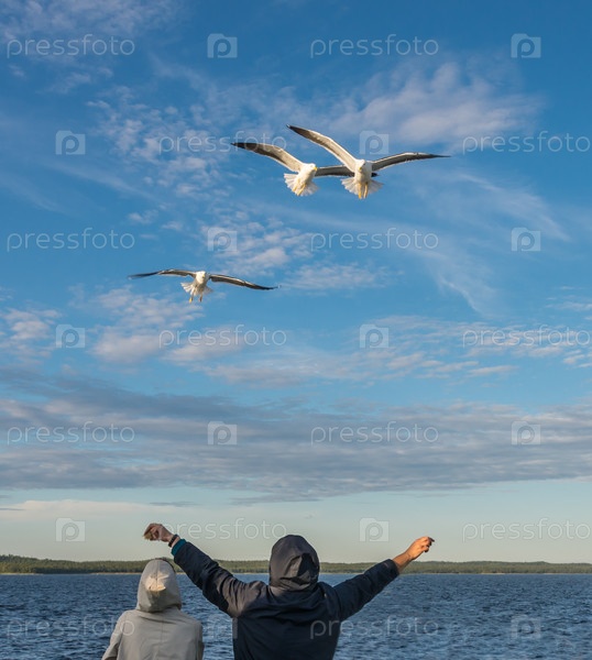 Мужчина приглашает чаек. Соловецкий архипелаг, Белое море, Россия