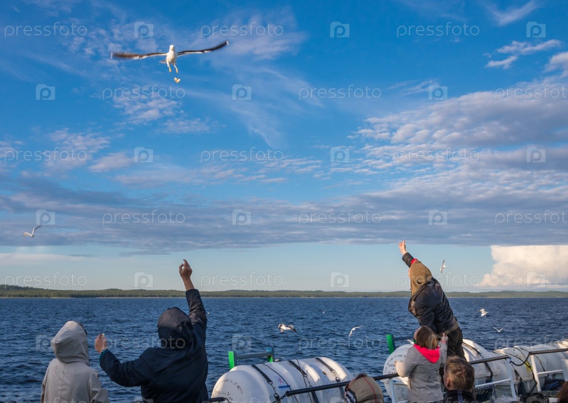 Туристы на борту покормили чаек. Соловецкий архипелаг, Белое море, Россия