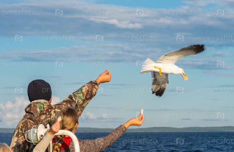 Пассажиры корабля кормят чаек. Соловецкий архипелаг, Белое море, Россия