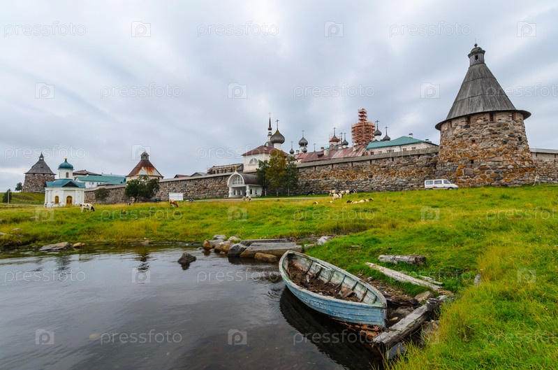 Вид на Соловецкий монастырь (Кремль). На переднем плане старая рыбацкая лодка. Большой Соловецкий остров, Белое море, Архангельская область, Россия