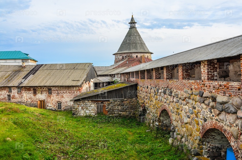Внутренний двор Соловецкого монастыря и паломники. Соловецкий архипелаг, Белое море, Россия