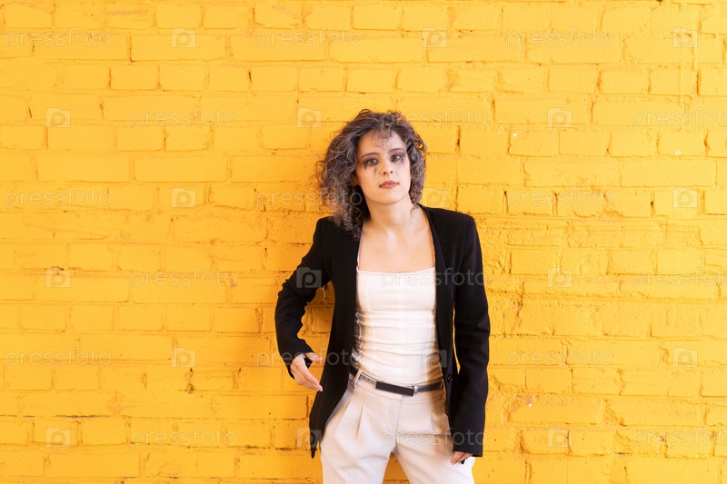 Молодая красивая женщина позирует в черной куртке на улице