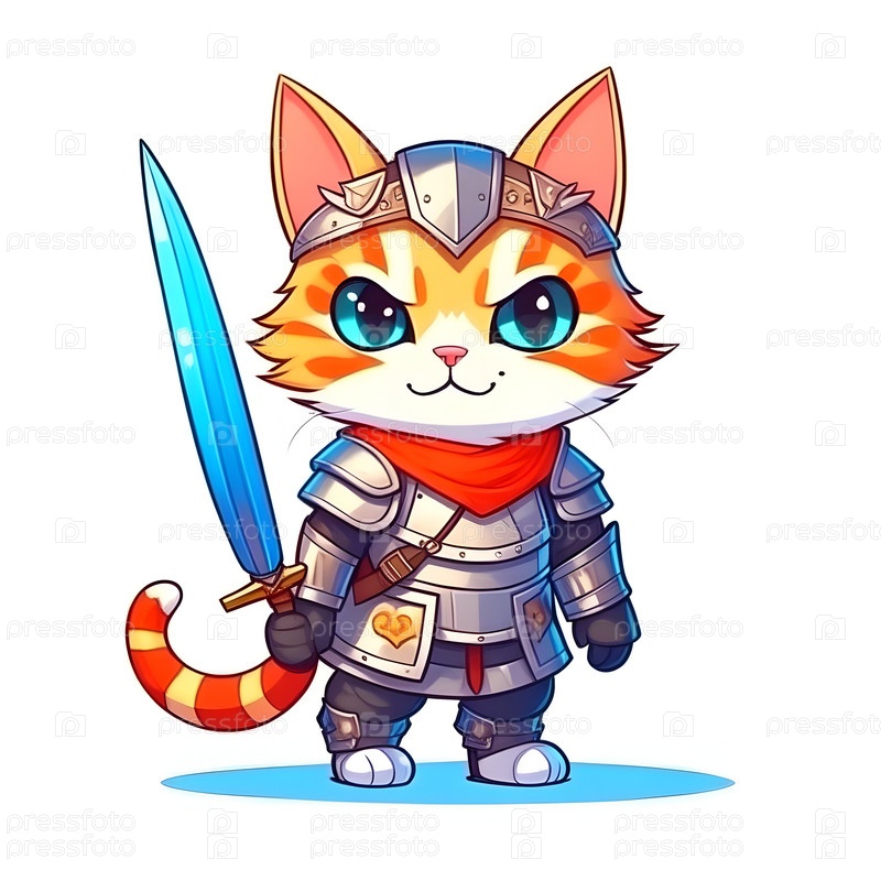 Рисунок рыжего котенка с мечом и доспехами на белом фоне