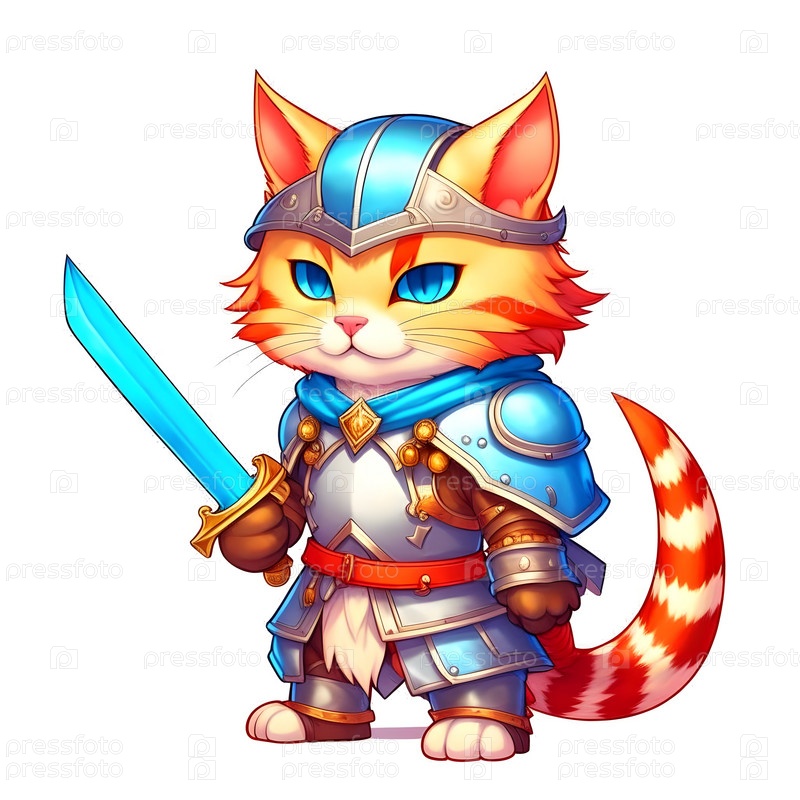 Рисунок рыжего котенка со шлемом, мечом и доспехами на белом фоне