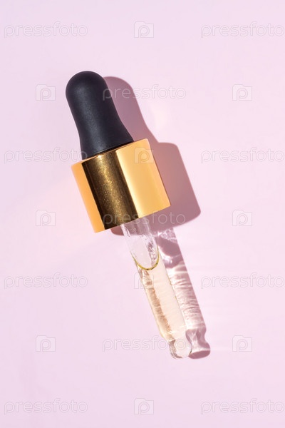 Брендинговый макет стеклянной бутылки-капельницы. Косметическая пипетка. Модный розовый фон. Концепция органической и косметической косметики. Резкий солнечный свет. Вид сверху