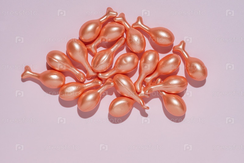 Однодозовые капсулы сыворотки с активными ингредиентами, разбросанными на розовом фоне. Товары для ухода за кожей и красоты