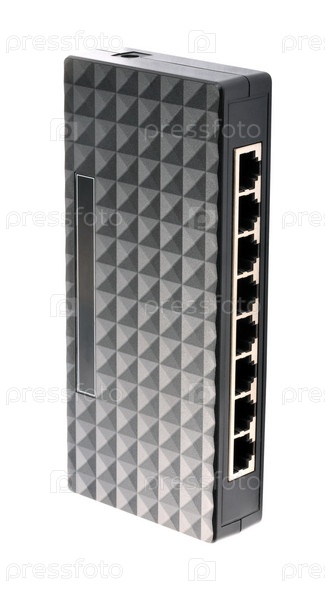 Черный 8-портный пластиковый коммутатор Ethernet, изолированный на белом спине