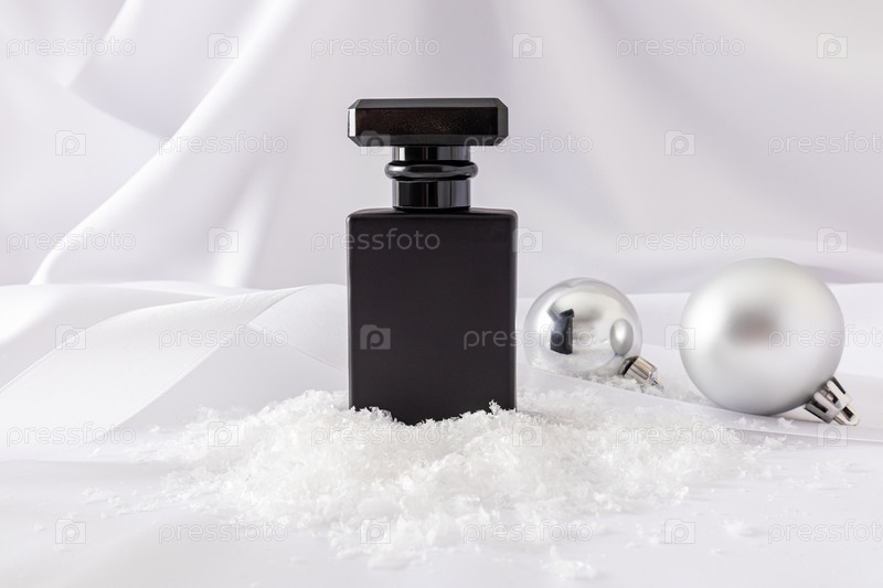 Шикарный матовый черный мужской флакон духов на атласном фоне белой ткани с серебряными елочными шарами. Передний план. Шаблон бутылки. Реклама продукта