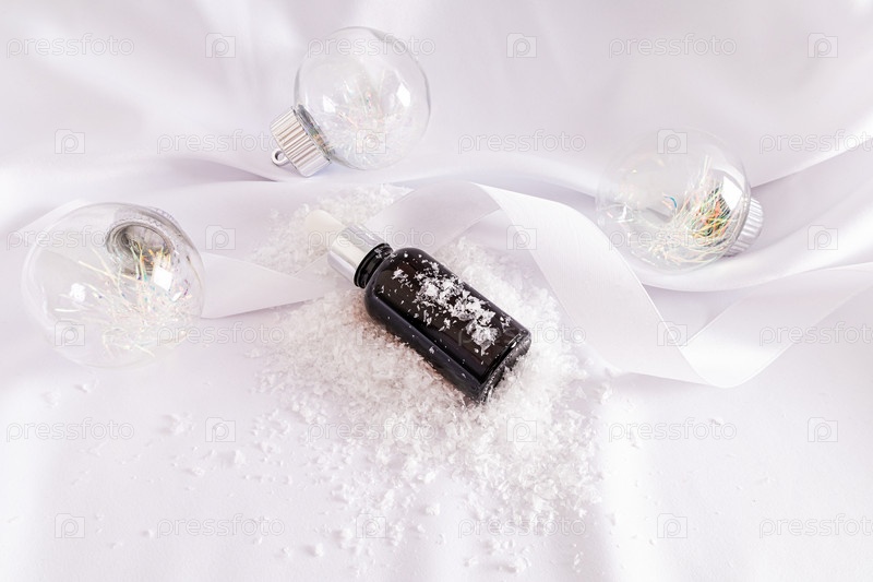 Стеклянная косметическая бутылочка с капельницей лежит на белом атласе и искусственном снегу среди модных стеклянных шариков. Концепция новогодней косметики