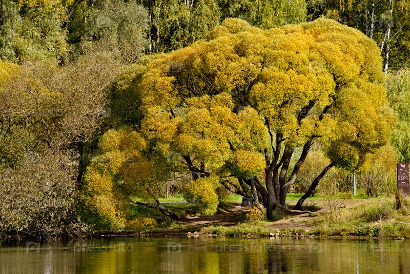 Россия. Московский парк Покровское Стрешнево. Вид на свисающие над водой ветки плакучей ивы по берегам прудов парка