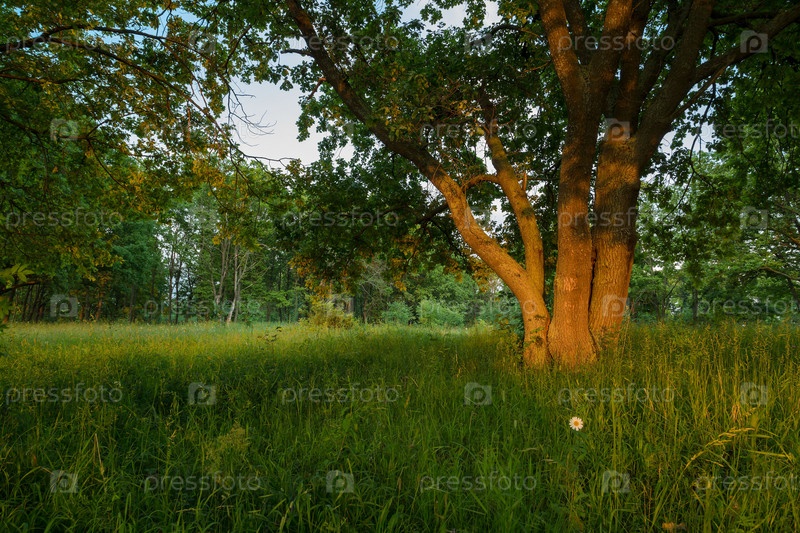 Вечерний пейзаж с дубами и ромашкой на переднем плане