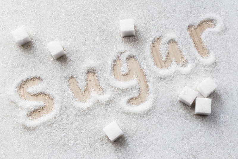 Надпись «Сахар» на сахарном песке. Кубики рафинированного сахара