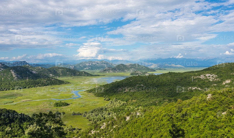 Красивые пейзажи Скадарского (Скодерского) озера среди гор. Озеро заросло травой. Черногория, Европа