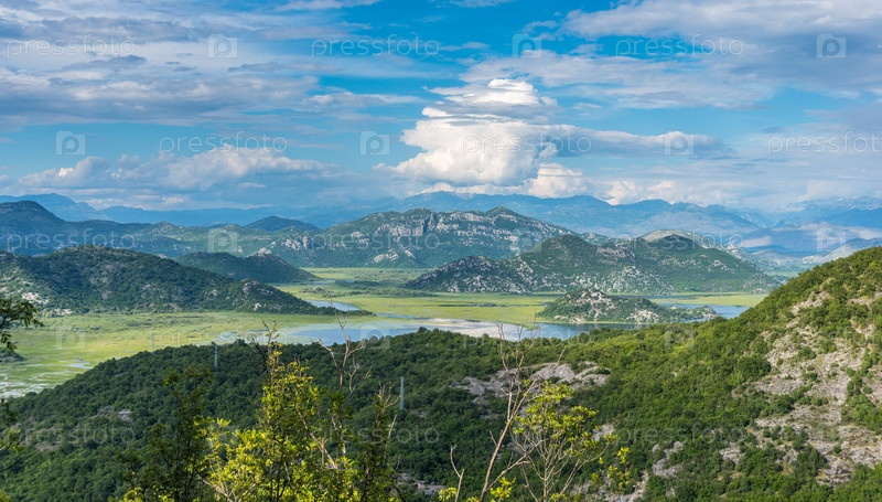 Красивый пейзаж Скадарского (Скодерского) озера в горах. Удивительные кучевые облака. Черногория, Европа