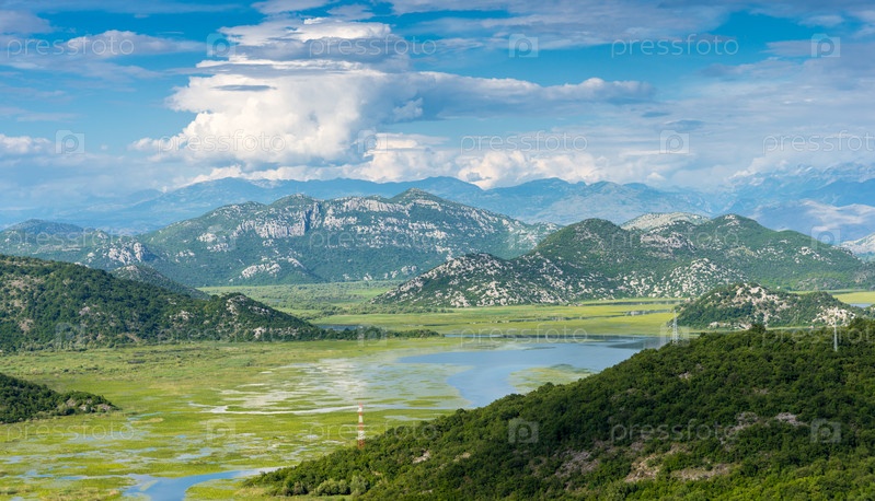 Прекрасный вид на Скадарское (Скодерское) озеро среди гор. Этот участок озера зарос высокой травой. Черногория, Европа
