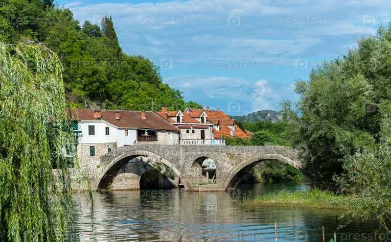 Старый мост и дома в городе реки Црноевица. Мост отражается в воде. Черногория, Европа