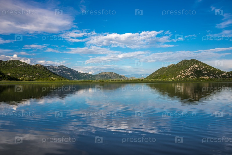 Красивые пейзажи Скадарского озера с отражением гор и облаков в воде. Черногория, Европа