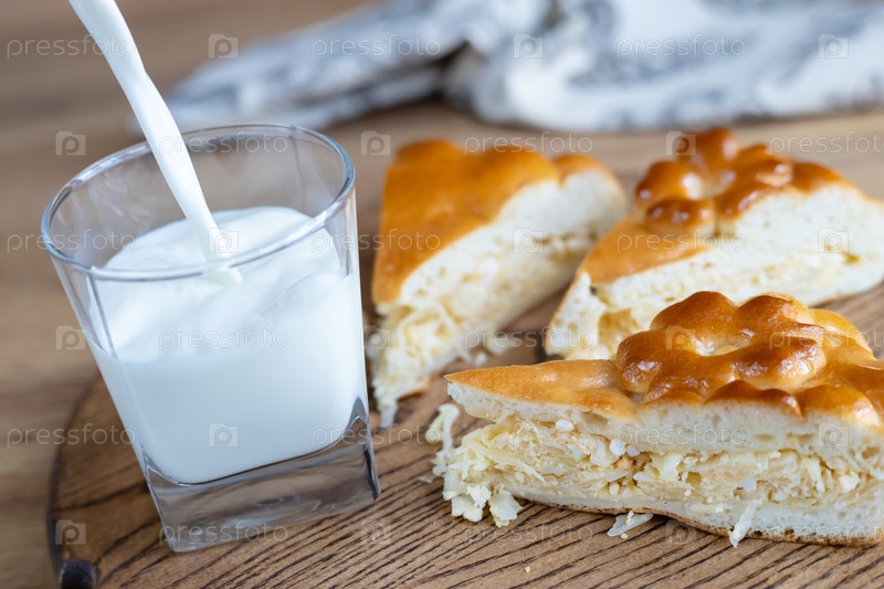 Молоко льется в стакан и пирог с капустой