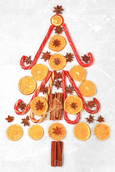 Рождественский фон в виде съедобной елки с традиционными зимними специями для повышения иммунитета в холодный период. Звездчатый анис, корица, сушеные апельсины и мандарины на темном фоне. Канун Нового года