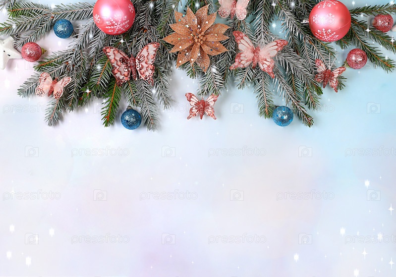 Красивая рождественская и новогодняя композиция, фон с огнями, украшениями, игрушками с еловыми ветками и местом для текста. Праздничная открытка, баннер на экране, настройка продукта для праздничной рекламы, концепция сочельника, выборочный фокус,