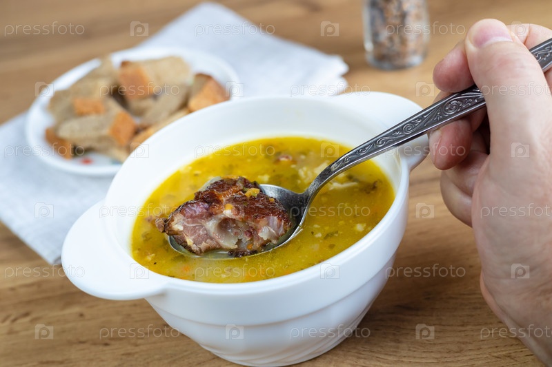 Рука держит ложку с копченостью из супа