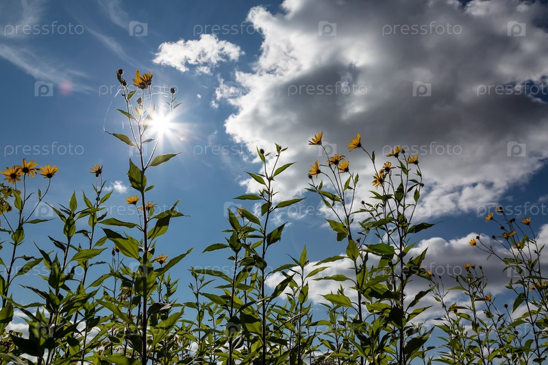 Луговые желтые цветы на фоне солнечного неба