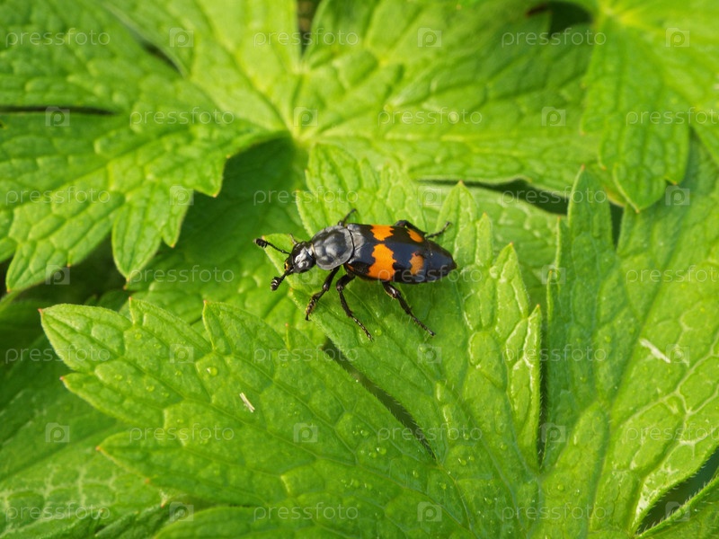 Жук-могильщик на зеленом листе в летнем саду